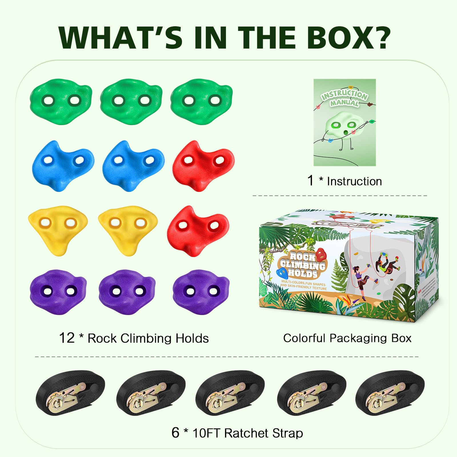 - 12 colorful climbing holds in 5 bright colors and 3 unique shapes